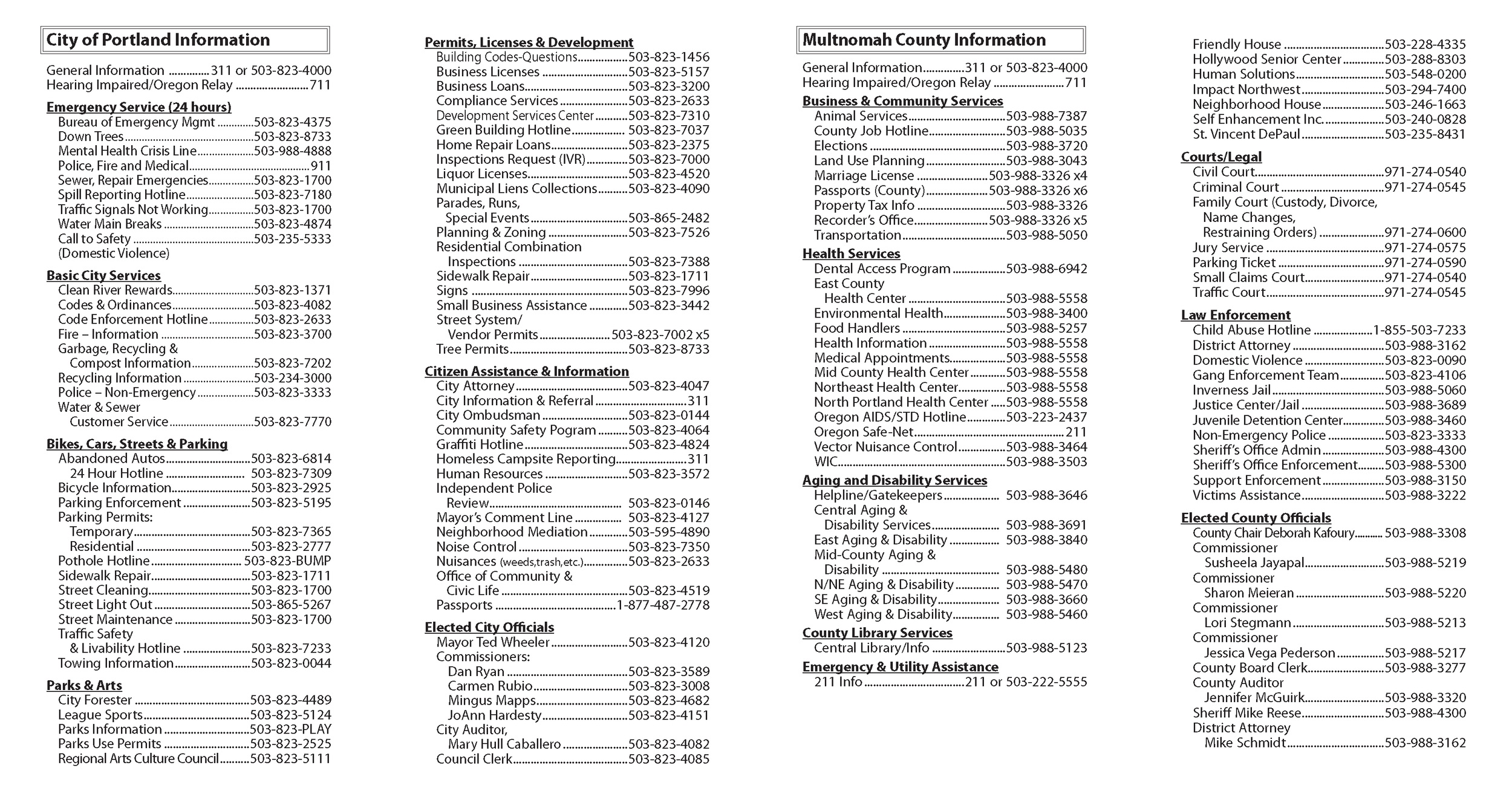 | PARK RANGERS For security/public safety concerns in public parks | 503-823-1637 |
